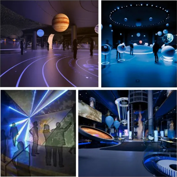 通過3D投影、多屏觸控、光纖燈等現代科技手法,呈現魚類、珊瑚等豐富多彩的海洋場景。設置“深海巡游”體驗展項,參觀者可通過坐上特制設備,身臨其境遨游海洋深處。整個空間相對封閉,全方位營造“海”之意境。